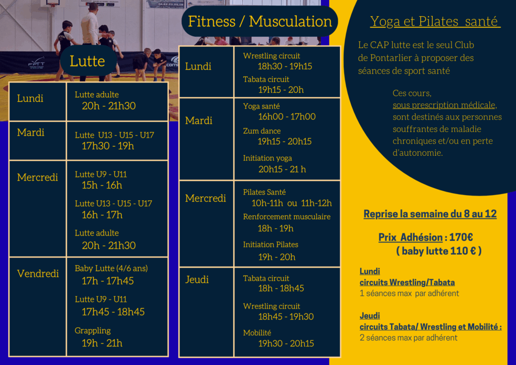 CLUB ATHLETIQUE PONTISSALIEN DE LUTTE Nous rejoindre Lire + LUTTE: Lutte féminine, lutte libre, lutte gréco-romaine, grapplingFITNESS: wrestling circuit, tabata circuit, yoga, pilates, zumba, renforcement musculaire.Entrainements, loisirs, comptétitionsActivité(s) proposée(s) Club house, Salle de musculation, Vestiaire avec douchesInstallations Lundi, mardi, mercredi, jeudi, vendrediJours et horaires d’entrainement l’équipe & les locaux